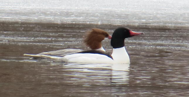 Common Mergansers nest in natural tree cavities or old woodpecker holes – LARGE tree cavities and woodpecker holes! They will also nest in boxes. I have a large duck nesting box out along my backyard shoreline. I had it installed some years ago in hopes to entice them to stay – nope, I’ve never even seen them check it out!